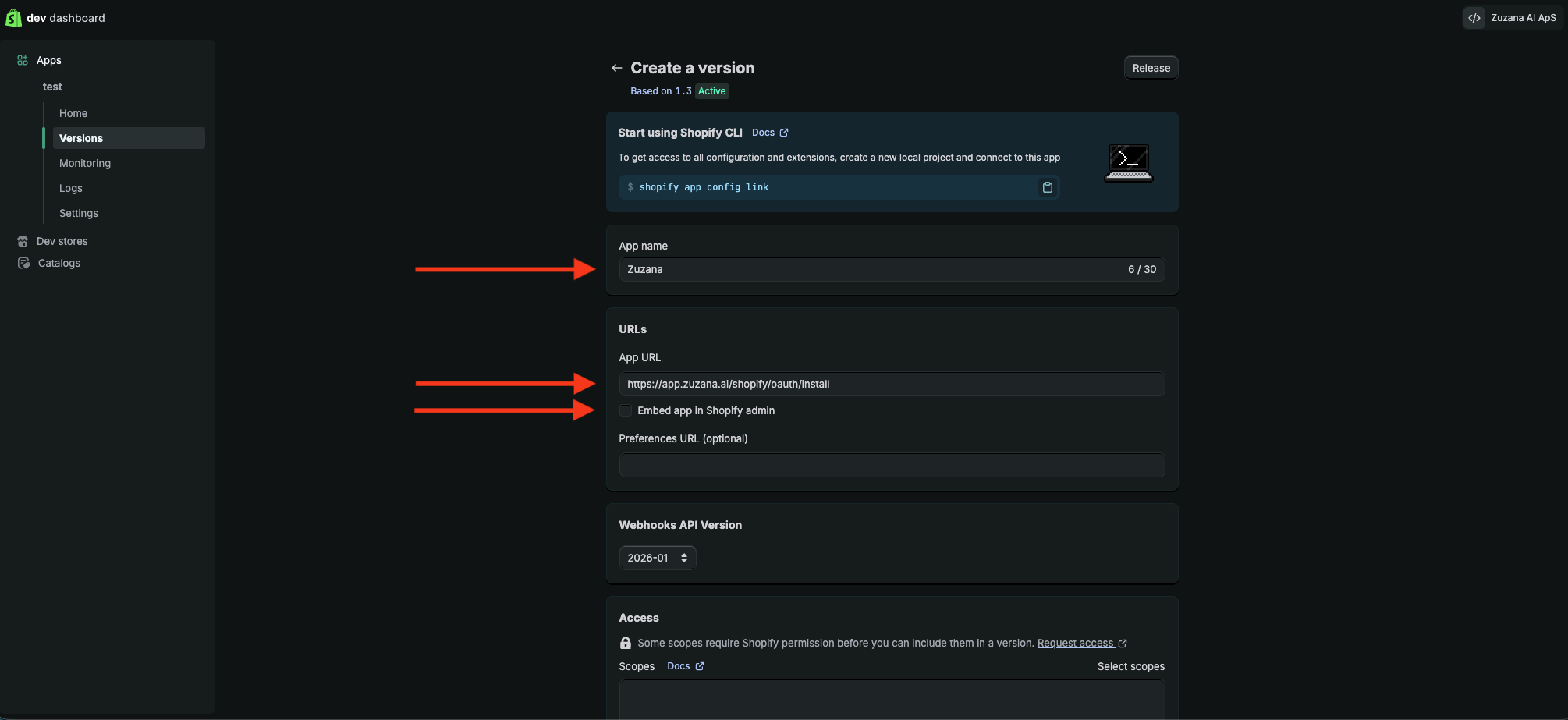 Scroll down to Access section. In the Scopes text area, copy and paste the following permissions exactly:read_customers, read_orders, write_orders, read_products, read_returns, write_returns Configure Redirect URLs: Copy & paste: https://app.zuzana.ai/shopify/oauth/callbackFinalize Version: Scroll down and click Create version . You should see a confirmation that "Version 1.0" (or similar) has been successfully created.Step 4